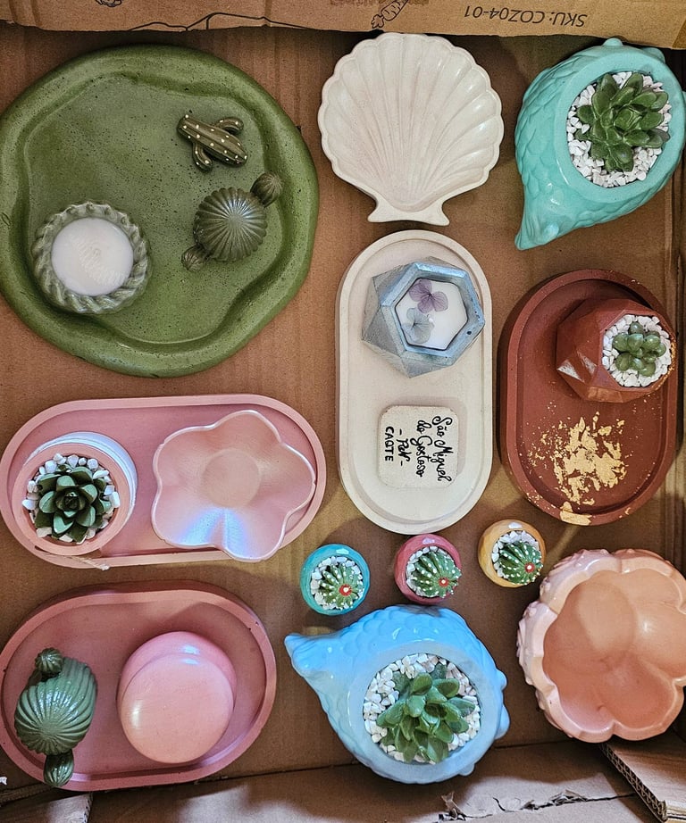 Cada peça de cimento é criada por mim, uma arquiteta apaixonada pela praia e pelo artesanal.